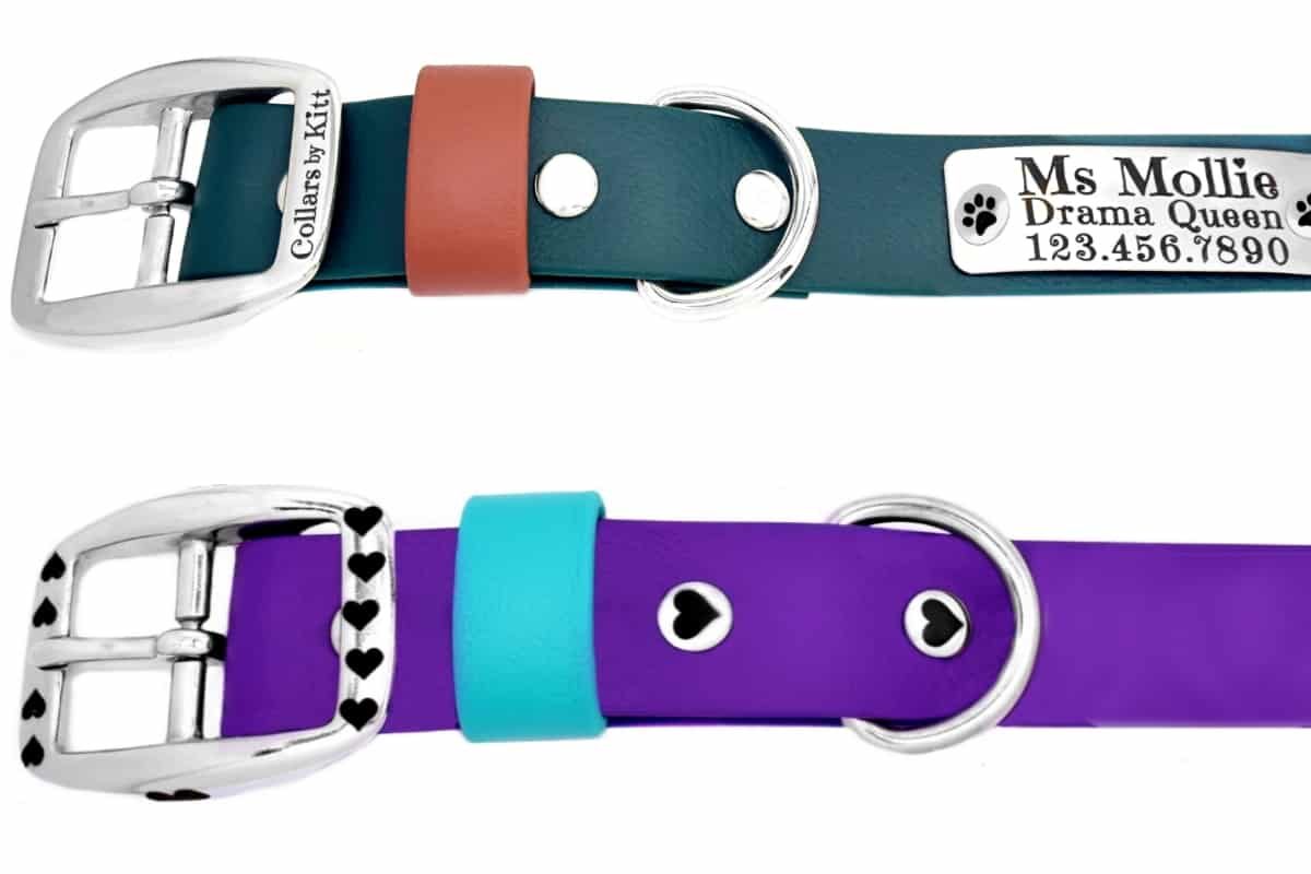 Collars and Leashes have a laser engraved “Collars by Kitt” somewhere on their stainless steel hardware so you’ll remember where they came from. When you decide your other dog must have one or when your friends ask “Where did you get that?”, you won’t forget. 🙂