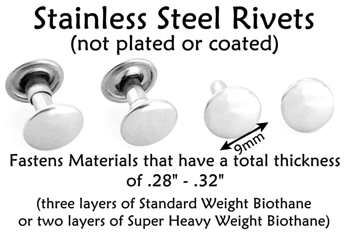 These rivets require more force to set than plated or brass rivets. Stainless steel is a harder metal and not as malleable. More difficult to set but much more durable and strong once set.